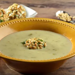 Asparagus Cream, Goat Cheese, and Fried Pine Nuts