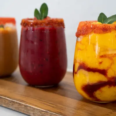 Serve the tamarind mixture in the rimmed glass. Decorate with frozen mango cubes and spicy tamarind.