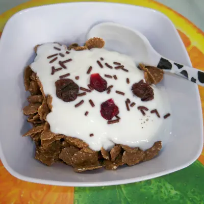 Healthy and easy to make, this recipe for cereal with yogurt and chocolate sprinkles.