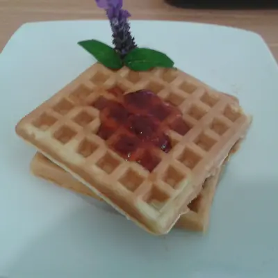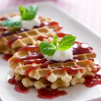 This basic waffle recipe is served with a strawberry sauce. You can substitute it with maple syrup and a bit of whipped cream.