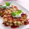 Serve the waffles hot with the strawberry sauce on top and a bit of whipped cream in the center.