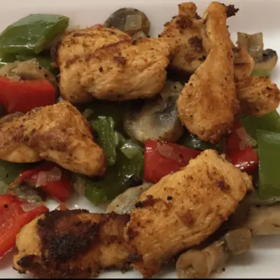 Without cleaning the skillet, heat the other tablespoon of oil. Remove the chicken from the marinade, and discard the marinade. Add the chicken to the skillet and sauté until cooked through on both sides. Season with salt and pepper. Cut the chicken into strips 2 cm wide. Combine with the vegetables, and serve.