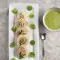 For the spinach sauce, sauté the onion and garlic with a little flour, remove from heat, and blend all of this with the spinach and a little liquid.