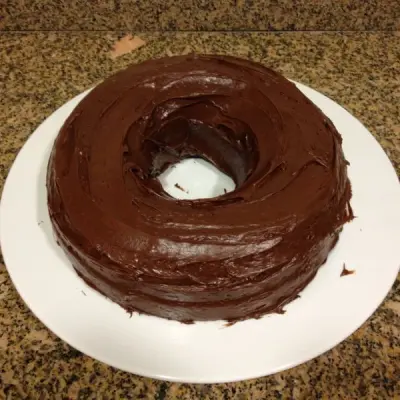 Once the cake has cooled, coat it with the chocolate frosting.