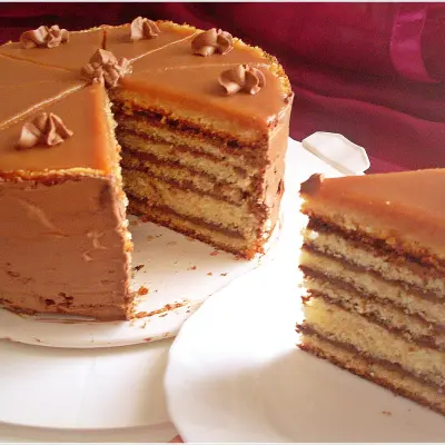 A much easier and quicker version of the Dobos cake. This cake of Hungarian origin is a delicious dessert. It is made of layers of sponge cake interspersed with hazelnut cream and covered with caramel. A different dessert that you have to try.