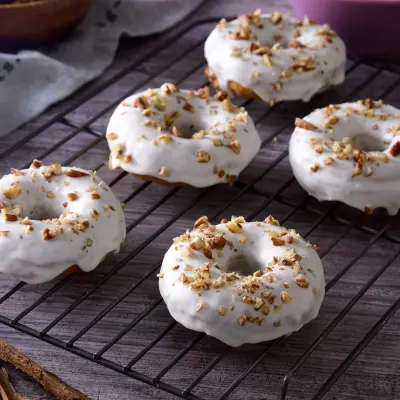 Enjoy this excellent and healthy recipe, delicious and fluffy carrot donuts with cream cheese frosting and walnuts, which you can indulge in without guilt because they are baked. Don't miss trying them!