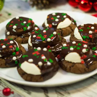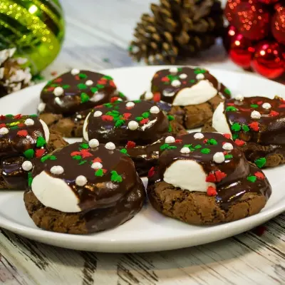 Prepare these delicious and original hot chocolate cookies. They are very easy to make and have a firm texture on the outside but soft on the inside, covered with a chocolate ganache and topped with a melted marshmallow. Don't miss out on trying them.