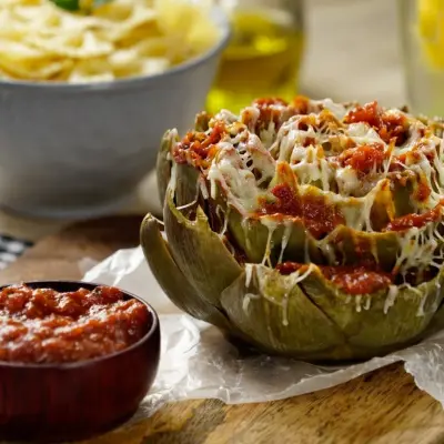 For artichoke lovers, prepare these delicious baked artichokes accompanied by a rustic sauce of natural tomato and topped with a rich combination of parmesan and manchego cheese. It will be the perfect appetizer!