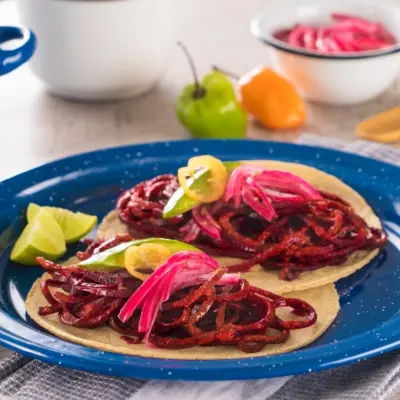 If you are a fan of cochinita pibil, here is a different option made with Eva® beet noodles with the classic marinade, served in tacos and accompanied by pickled onions with habanero and a few drops of lime, you'll love them!