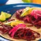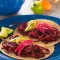 Heat the corn tortillas on a griddle and serve the beet cochinita. Serve with pickled onions with habanero, avocado, and lime.