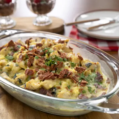 Add the chopped bacon and serve the chicken gratin with a salad.