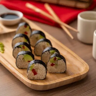 On a cutting board, slice the sushi, place it on a flat plate, and serve with soy sauce.