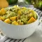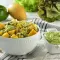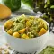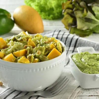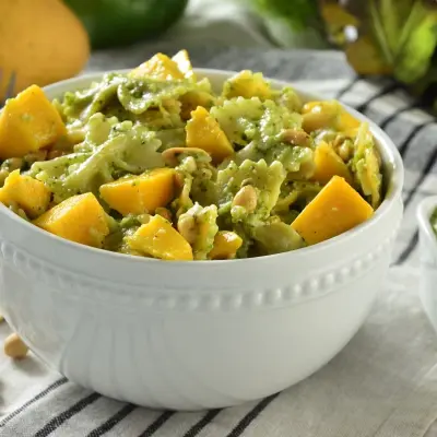 In a bowl, mix the cold pasta with the avocado, mango, peanuts, salt, pepper, and dressing.