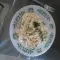 Cook the pasta for 7 to 9 minutes in 2 liters of water with onion, garlic, and salt.