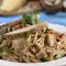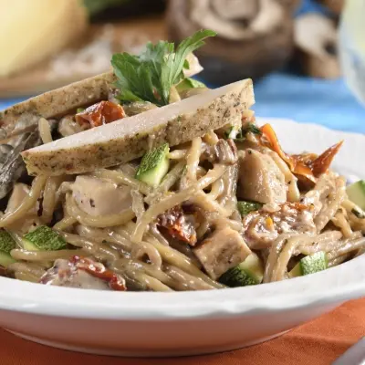 Delicious easy and quick pasta to prepare, all directly in the pot! It is accompanied by mushrooms, zucchini, sun-dried tomatoes, and a creamy cheese sauce, along with delicious slices of FUD® Herb Chicken Breast.