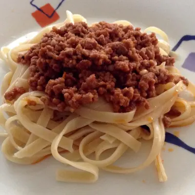 Serve the pasta hot, then add the meat sauce. Top with aged cheese or cotija cheese.