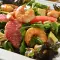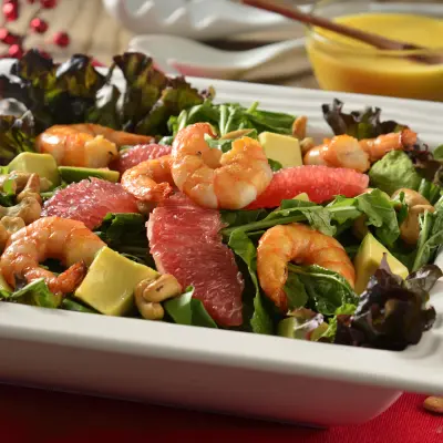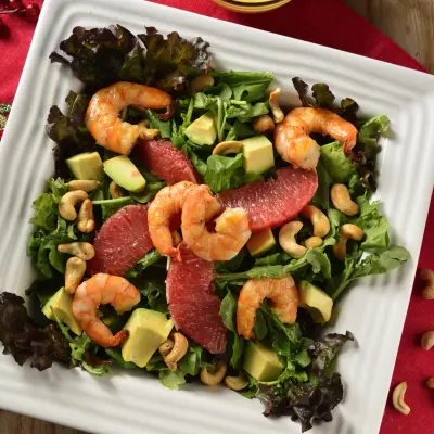 Chop the red leaf lettuce and place it in a salad bowl, add the baby arugula, the shrimp, the grapefruit wedges, the cashews, and the avocado slices.