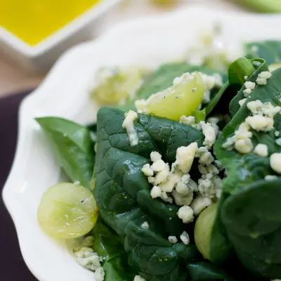 In a deep bowl, mix the spinach, grapes, and crumbled Gorgonzola cheese, and season with the dressing.