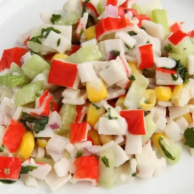Place a bed of lettuce on the plate, on top of which we will add the crumbled surimi sticks, sliced bell pepper in small julienne, red onion, and corn kernels. Add croutons if desired.