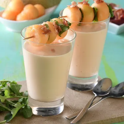 Prepare this delicious cold melon soup, which is the perfect option for this summer. It has a touch of Greek yogurt, making it very creamy, and the refreshing flavor of mint. Garnished with fresh melon pearls.