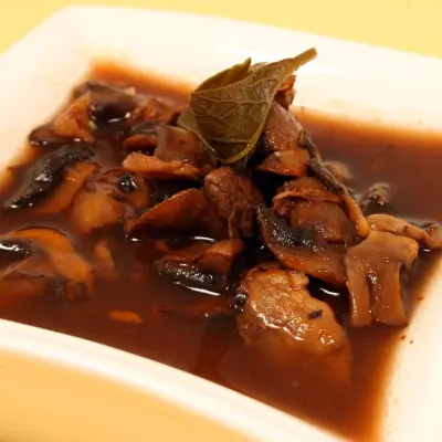 Blend the guajillo pepper, tomato with water, strain, add to the mushrooms, add the chicken broth, season with salt and pepper, let reduce, add the epazote sprig, and cook on low heat.